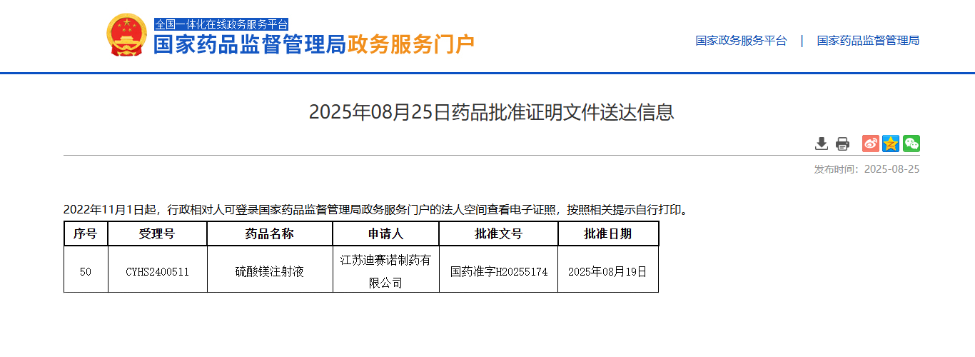 近日,博鱼网页版收到国家药品监督管理局签发的硫酸镁注射液获批信息通知,并在国家药品监督管理局政务服务门户平台公示。